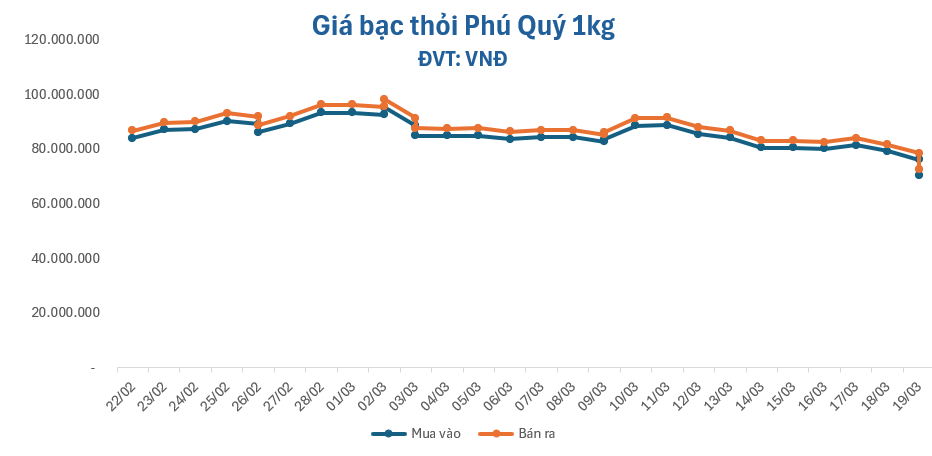 Giá bạc thỏi 1kg giảm sâu gần 6.000.000 đồng, giao dịch dưới mốc 73.000.000 đồng/kg, lùi về mức 70.533.157 – 72.719.818 đồng (mua – bán), giảm 5.653.319 đồng chiều mua và giảm 5.813.319 đồng chiều bán.
