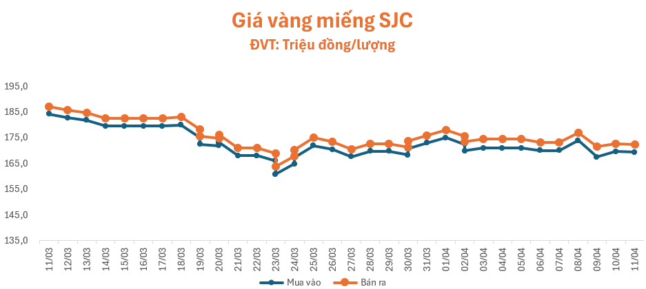 Giá vàng quay đầu giảm nhẹ trong phiên giao dịch cuối tuần (11/4), giá vàng miếng SJC tại cửa hàng SJC, Bảo Tín Minh Châu, Phú Quý, PNJ và Doji đồng loạt niêm yết ở mức 169,4 – 172,4 triệu đồng/lượng (mua – bán), giảm 0,3 triệu đồng/lượng ở cả chiều mua và chiều bán so với giá khảo sát sáng qua, chênh lệch mua – bán ở mức 3 triệu đồng/lượng.