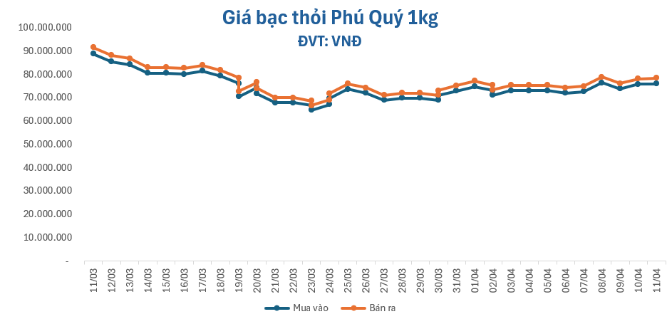 Giá bạc thỏi 1kg tăng nhẹ, giao dịch trên mốc 78.000.000 đồng/kg, quanh mức 76.026.477 – 78.373.137 đồng/kg (mua – bán), tăng 240.000 đồng ở chiều mua và tăng 239.999 đồng ở chiều bán.