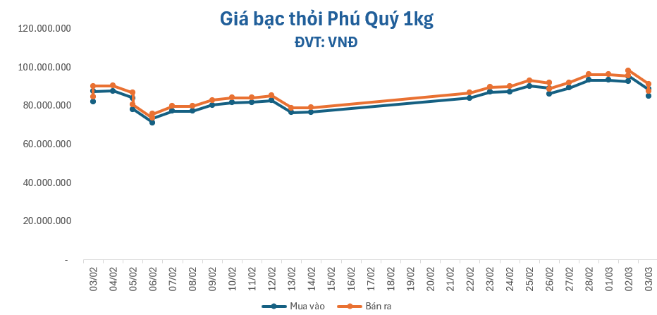 Giá bạc thỏi 1kg giảm gần 4.000.000 đồng, giao dịch dưới mốc 88.000.000 đồng/kg, quanh mức 85.013.121 – 87.653.114 đồng (mua – bán), giảm 3.626.657 đồng chiều mua và giảm 3.733.324 đồng chiều bán.