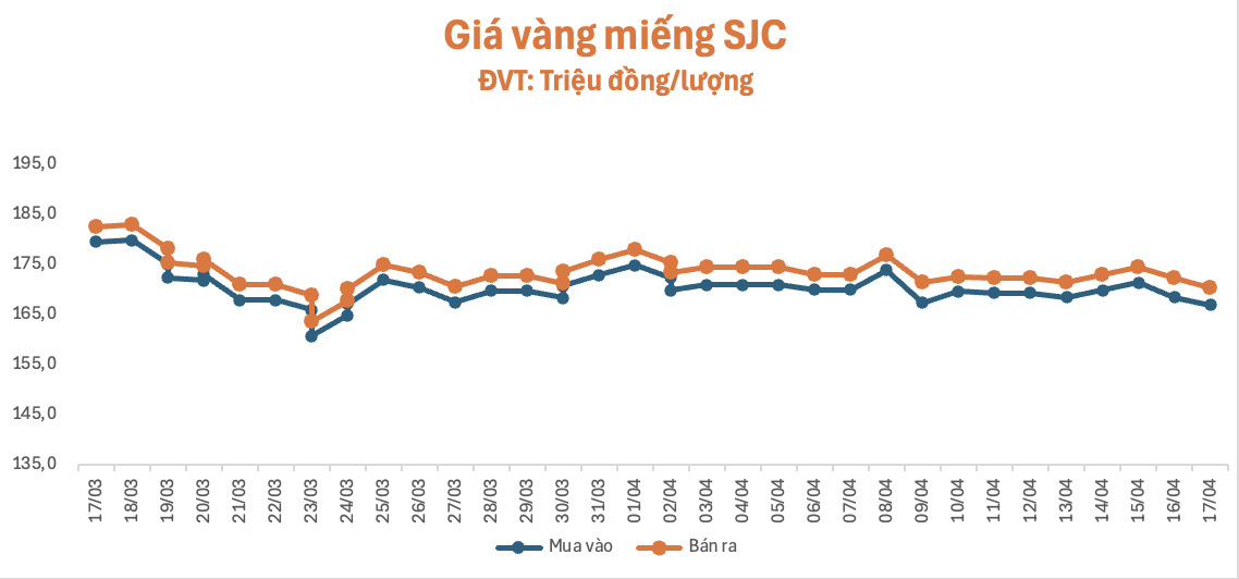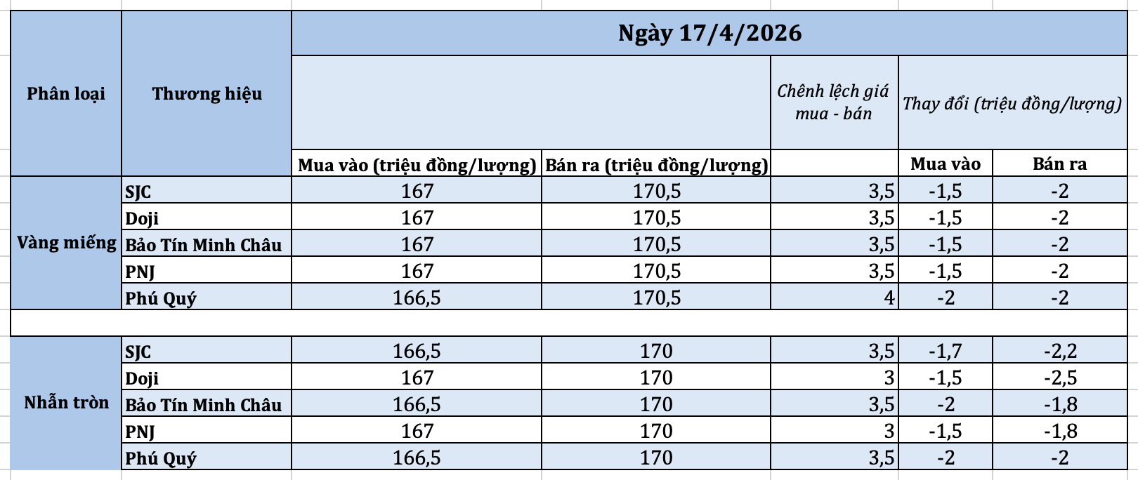 Giá vàng tiếp đà giảm mạnh trong phiên giao dịch sáng nay (17/4), lúc 9 giờ 10 phút, giá vàng miếng SJC tại cửa hàng SJC, Doji, Bảo Tín Minh Châu và PNJ đồng loạt niêm yết ở mức 167 – 170,5 triệu đồng/lượng (mua – bán), giảm 1,5 triệu đồng/lượng ở chiều mua và giảm 2 triệu đồng/lượng ở chiều bán so với giá khảo sát sáng qua, chênh lệch mua – bán ở mức 43,5triệu đồng/lượng.