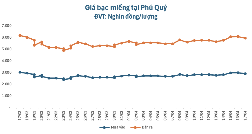 Tại Doji, giá bạc miếng giảm 69.000 đồng/lượng ở chiều mua và giảm 71.000 đồng ở chiều bán, đạt mức 2.952.000 – 3.043.000 đồng/lượng (mua – bán).