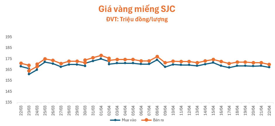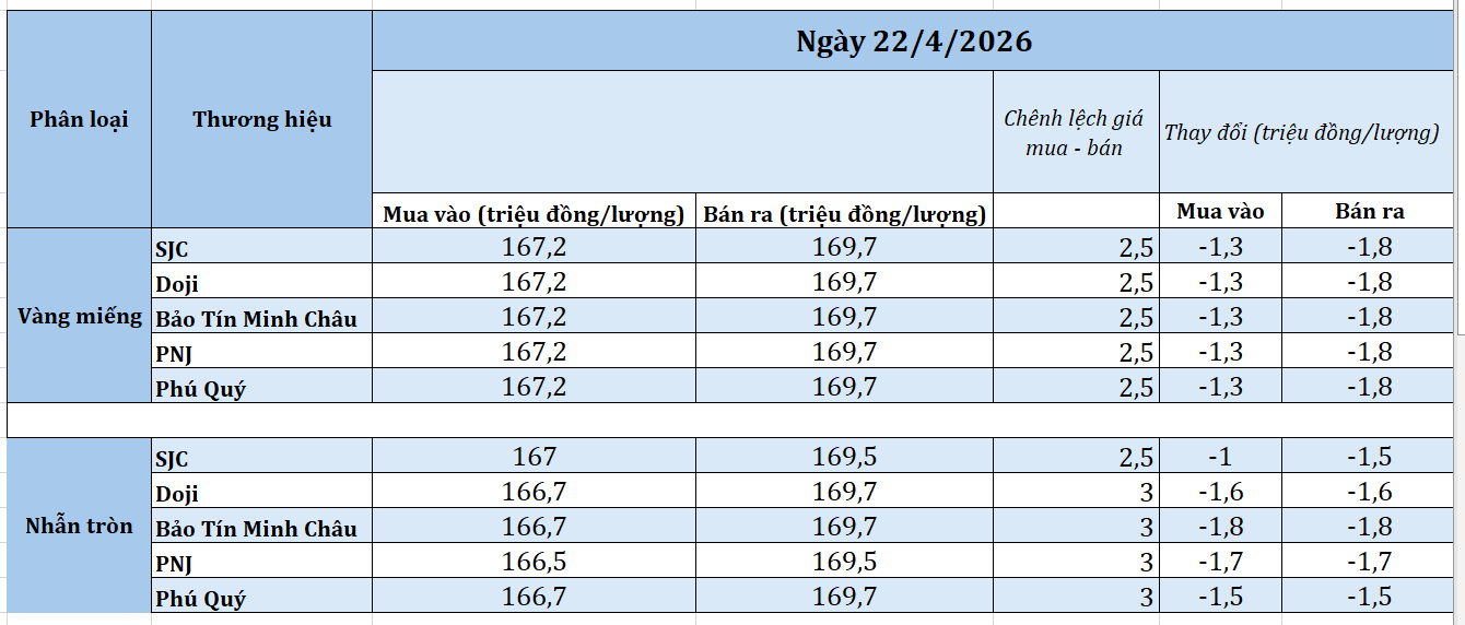 Giá vàng đảo chiều giảm sâu trong phiên giao dịch sáng nay (22/4), lúc 10 giờ, giá vàng miếng SJC tại cửa hàng SJC, Phú Quý, Doji, Bảo Tín Minh Châu và PNJ đồng loạt niêm yết ở mức 167,2 – 169,7 triệu đồng/lượng (mua – bán), giảm 1,3 triệu đồng/lượng ở chiều mua và giảm 1,8 triệu đồng/lượng ở chiều bán so với giá khảo sát sáng qua, chênh lệch mua – bán ở mức 2,5 đồng/lượng.