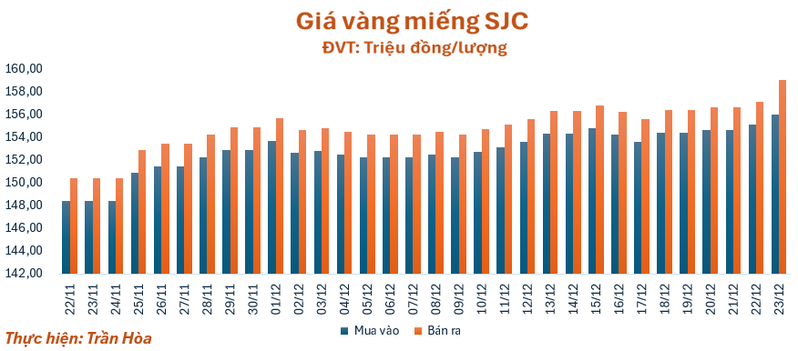 Phiên giao dịch sáng 23/12, giá vàng miếng SJC, Bảo Tín Minh Châu, Doji và PNJ đồng loạt được điều chỉnh tăng mạnh 1,9 triệu đồng/lượng ở cả chiều mua và chiều bán so với giá khảo sát sáng qua, đạt mốc 157 - 159 triệu đồng/lượng (mua – bán), chênh lệch hai chiều ở ngưỡng 2 triệu đồng/lượng.