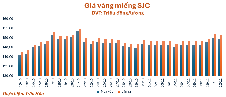 Phiên giao dịch ngày hôm nay (12/11), giá vàng giảm nhẹ so với giá khảo sát sáng qua, quanh mốc 149,5 – 151,5 triệu đồng/lượng (mua – bán), giảm 0,5 triệu đồng/lượng. Chênh lệch giá mua vào - bán ra ở ngưỡng 2 triệu đồng/lượng.