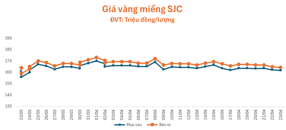 Giá vàng tiếp đà đi xuống trong phiên giao dịch sáng nay (23/4), lúc 10 giờ 10 phút, giá vàng miếng SJC tại cửa hàng SJC, Phú Quý, Doji, Bảo Tín Minh Châu và PNJ đồng loạt niêm yết ở mức 166,7 – 169,2 triệu đồng/lượng (mua – bán), giảm 0,5 triệu đồng/lượng ở cả chiều mua và chiều bán so với giá khảo sát sáng qua, chênh lệch mua – bán ở mức 2,5 đồng/lượng.