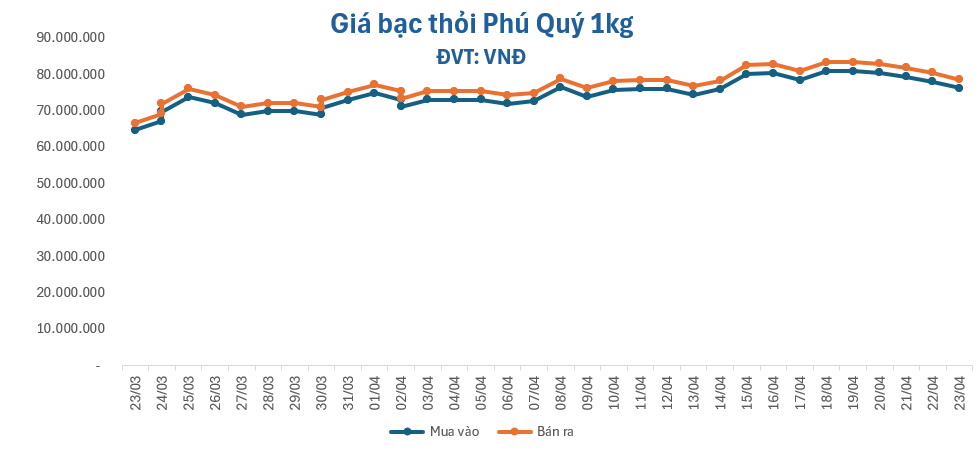 Giá bạc thỏi 1kg lùi về trên mốc 78.000.000 đồng/kg, giao dịch ở mức 76.239.809 – 78.586.470 đồng/kg (mua – bán), giảm 1.786.663 đồng ở chiều mua và giảm 1.839.996 đồng/kg ở chiều bán.