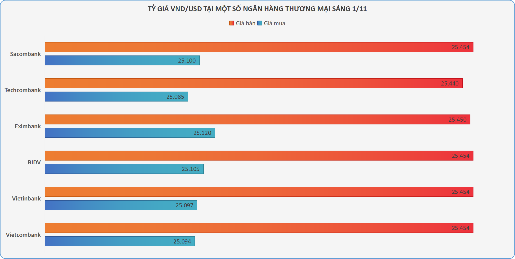 Cụ thể, Vietcombank đang niêm yết USD ở mức 25.094 - 25.454 VND/USD, giảm 21 đồng ở chiều mua và 1 đồng ở chiều bán so với phiên trước đó. Trong khi đó, VietinBank giảm 30 đồng ở chiều mua và 1 đồng ở chiều bán, đang niêm yết USD ở mức 25.097 - 25.454 VND/USD.