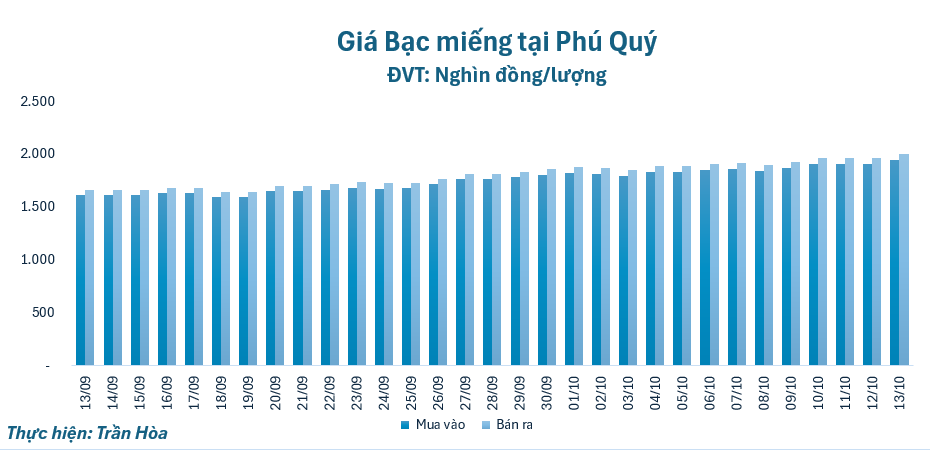 Giá bạc sáng 13/10 vãn tiếp tục duy trì đà tăng của tuần trước, tại Phú Quý, giá bạc tăng 36.000 đồng ở chiều mua và tăng 37.000 đồng chiều bán so với giá đóng cửa phiên cuối tuần trước, đạt mốc 1.944.000 – 2.004.000 đồng/lượng. Giá bạc thỏi 1kg cũng tiếp tục tăng gần 1 triệu đồng, hiện đang niêm yết ở mốc 51,839 – 53,439 triệu đồng (mua – bán).