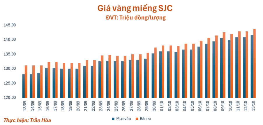 Đầu phiên giao dịch sáng nay (13/10), giá vàng miếng SJC tiếp tục đang quanh mốc 141,6 – 143,6 triệu đồng/lượng (mua – bán), tăng 0,8 triệu đồng/lượng so với giá đóng cửa tuần trước. Chênh lệch giá mua vào - bán ra ở ngưỡng 2 triệu đồng/lượng.