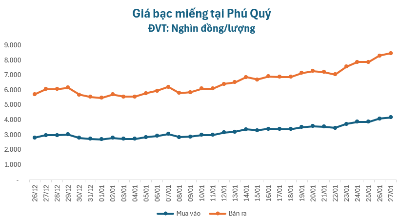 Giá bạc đã tăng hơn 54% từ đầu năm đến nay, khiến người mua bạc lãi đậm gần 40.000.000 đồng mỗi kg (giá bạc bán ra ngày 1/1/2026 là 74.000.000 đồng/kg).