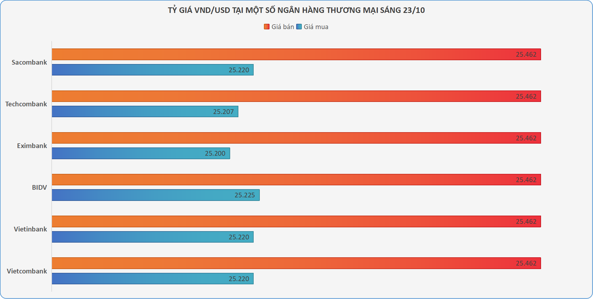 Ngân hàng BIDV giá USD tăng 128 đồng ở chiều mua và 10 đồng ở chiều bán, đang niêm yết ở mức 25.225 - 25.462 VND/USD. Eximbank đang niêm yết USD ở mức 25.200 - 25.462 VND/USD, tăng 10 đồng ở chiều bán so với phiên liền trước.