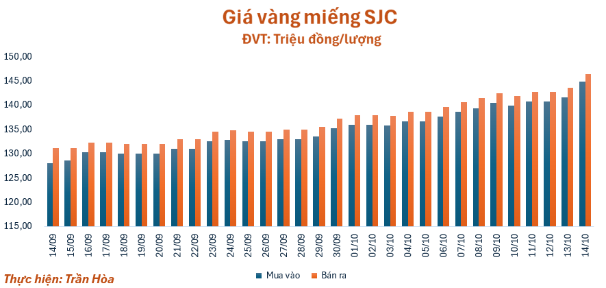 Đầu phiên giao dịch sáng nay (14/10), giá vàng miếng SJC tăng 3,3 triệu đồng/lượng ở chiều bán và tăng 2,8 triệu đồng/lượng ở chiều mua so với giá khảo sát sáng qua, hiện đang ở mốc 144,9 – 146,4 triệu đồng/lượng (mua – bán). Chênh lệch giá mua vào - bán ra ở ngưỡng 1,5 triệu đồng/lượng. Các cửa hàng lớn hiện đã không còn hàng để bán.