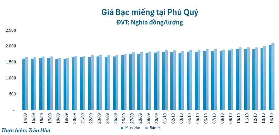 Giá bạc sáng 10/10 cũng tăng theo đà tăng của vàng. Tại Phú Quý, giá bạc tăng 92.000 đồng ở chiều mua và tăng 95.000 đồng chiều bán, đạt mốc 2.036.000 – 2.099.000 đồng/lượng. Giá bạc thỏi 1kg tiếp tục tăng 2,454 triệu đồng chiều mua và tăng 1,904 triệu đồng ở chiều bán, hiện đang niêm yết ở mốc 54,293 – 55,973 triệu đồng (mua – bán).