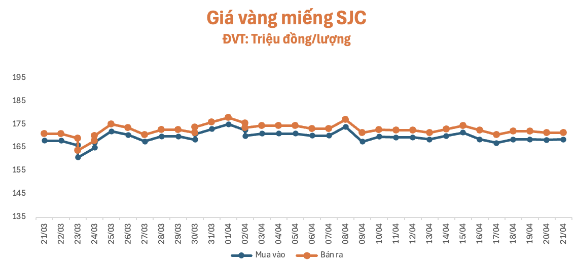 Giá vàng nhích nhẹ trong phiên giao dịch sáng nay (21/4), lúc 9 giờ, giá vàng miếng SJC tại cửa hàng SJC, Phú Quý, Doji, Bảo Tín Minh Châu và PNJ đồng loạt niêm yết ở mức 168,5 – 171,5 triệu đồng/lượng (mua – bán), tăng 0,2 triệu đồng/lượng ở chiều mua và gchiều bán so với giá khảo sát sáng qua, chênh lệch mua – bán ở mức 3 đồng/lượng.