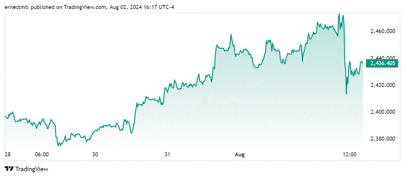 Giá vàng giao ngay kết thúc tuần này ở mức 2.432,19 USD/ounce, tăng 1,8% so với cuối tuần trước. Giữa tuần, giá có lúc lên tới 2.470 USD/ounce, sau khi Mỹ công bố dữ liệu việc làm trong tháng 7.