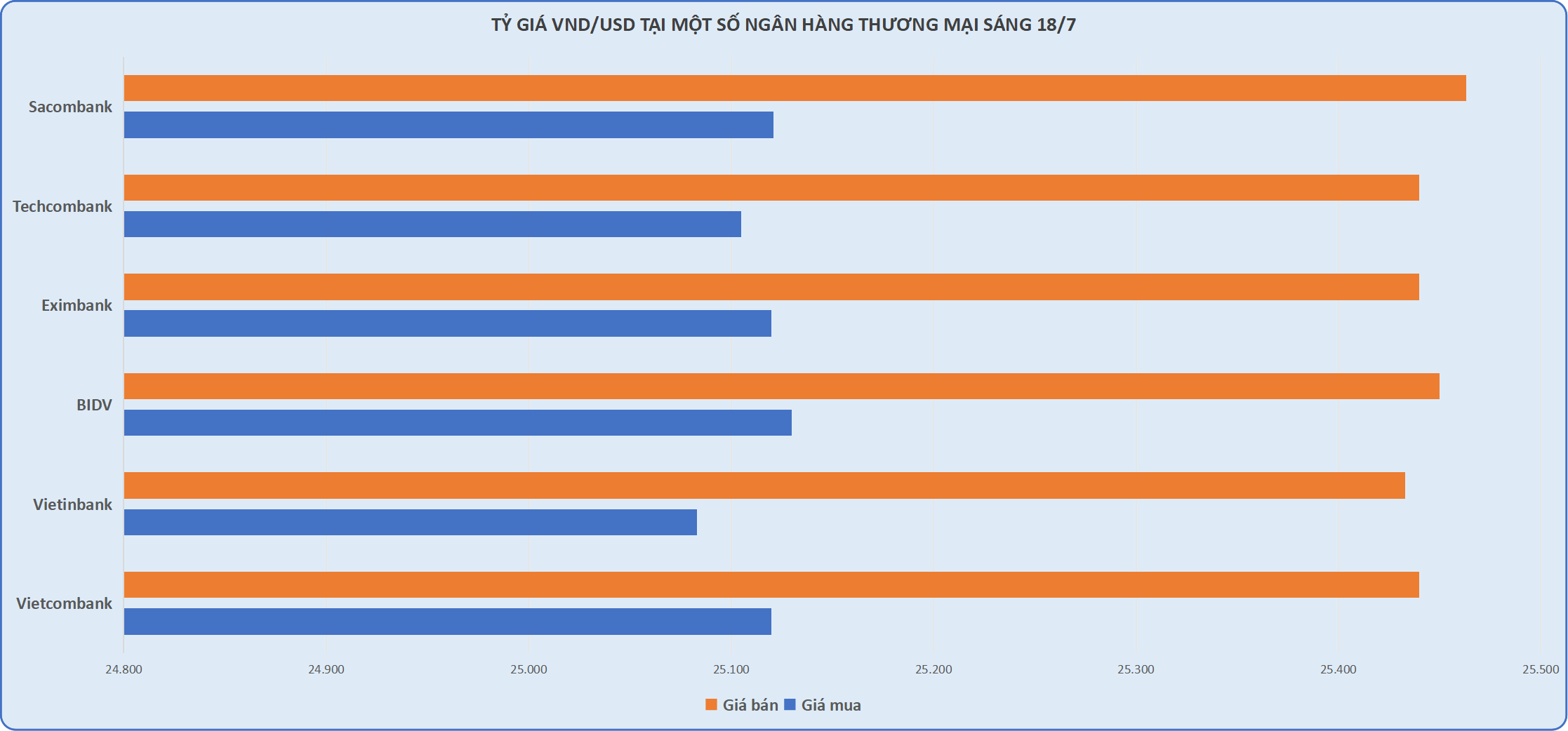 Vietinbank niêm yết USD ở mức 25.083 - 25.433 VND/USD, giảm 102 đồng ở chiều mua và 35 đồng ở chiều bán. BIDV đang niêm yết USD ở mức 25.130 - 25.450 VND/USD, giảm 118 đồng ở chiều mua và 18 đồng ở chiều bán so với phiên trước đó.