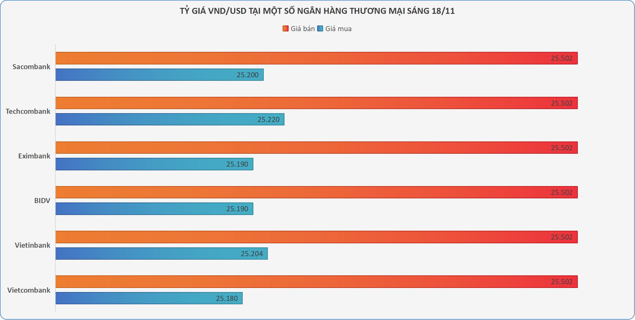 Techcombank giá USD đang niêm yết ở mức 25.220 - 25.502 VND/USD, tăng 5 đồng ở chiều mua và giảm 10 đồng ở chiều bán so với phiên trước. Trong khi Sacombank giá USD điều chỉnh giảm 10 đồng ở cả hai chiều mua vào - bán ra, đang niêm yết ở mức 25.200 - 25.502 VND/USD.