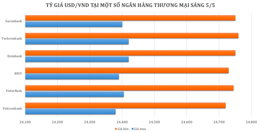 Trước đó, trong phiên 29/4, Ngân hàng Nhà nước (NHNN) niêm yết tỷ giá trung tâm ở mức 24.956 VND/USD, giảm nhẹ 4 đồng so với phiên đầu tuần. Tỷ giá mua giao ngay được niêm yết ở mức 23.759 VND/USD, cao hơn 50 đồng so với tỷ giá sàn; tỷ giá bán giao ngay được niêm yết ở mức 26.153 VND/USD, thấp hơn 50 đồng so với tỷ giá trần.