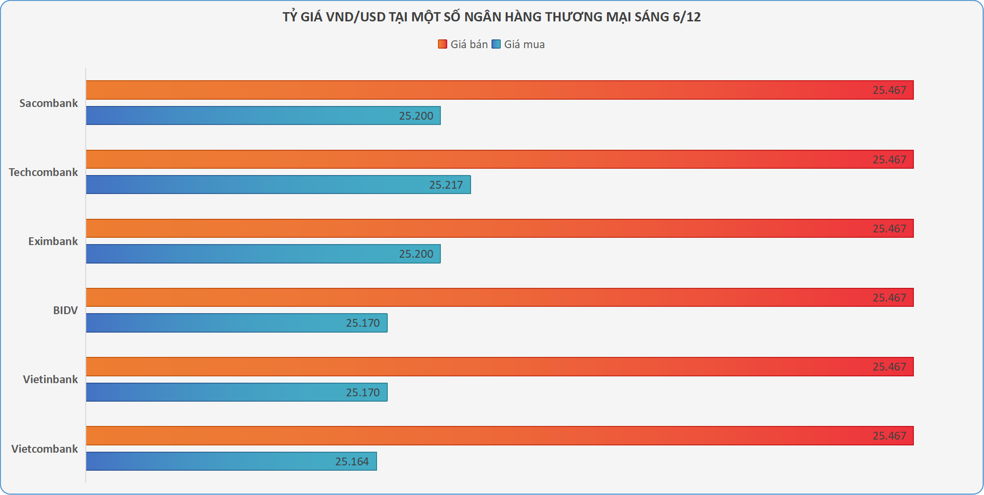 Trong khi, Sacombank giá USD đang niêm yết ở mức 25.200 - 25.467 VND/USD, giảm 10 đồng ở chiều mua và 12 đồng ở đồng ở chiều bán.