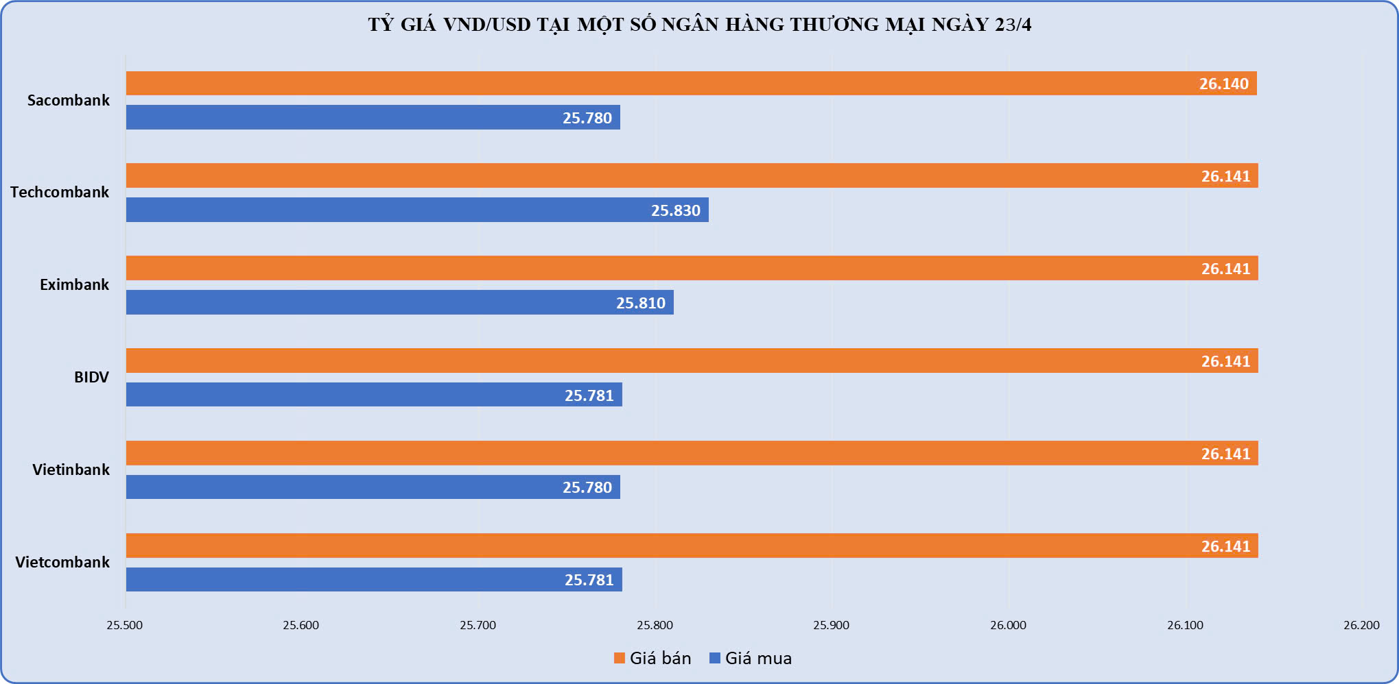 Cụ thể, tại Vietcombank và BIDV, giá USD đang niêm yết ở mức 25.781 - 26.141 VND/USD, tăng 51 đồng ở cả hai chiều mua vào và bán ra so với phiên trước đó. Tại Vietinbank giá USD điều chỉnh tăng 42 đồng ở chiều mua và 43 đồng ở chiều bán, đang niêm yết USD ở mức 25.780 - 26.141 VND/USD.