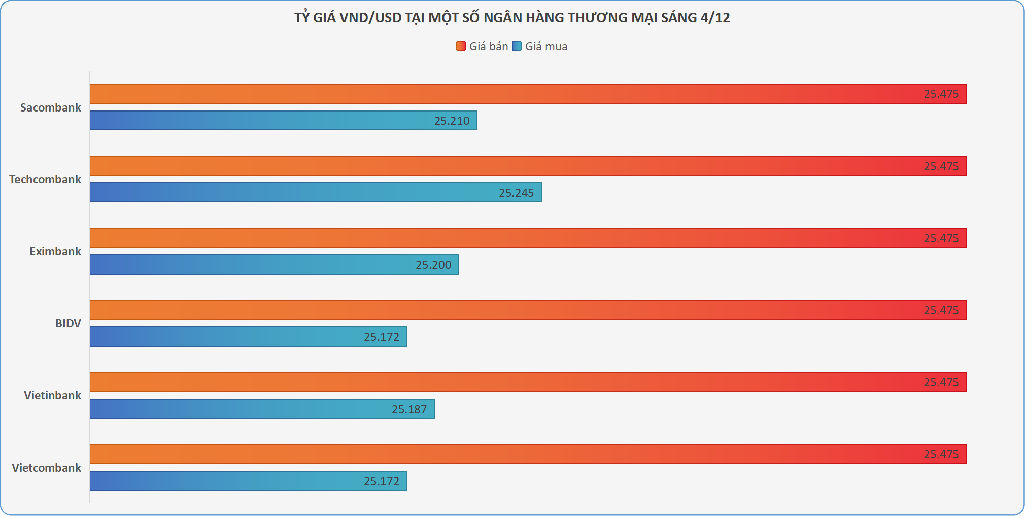 Trên thị trường liên ngân hàng, tỷ giá chốt phiên với mức 25.405 VND/USD, tăng 11 đồng so với phiên 2/12. Tỷ giá trên thị trường tự do không thay đổi ở cả hai chiều mua vào và bán ra, giao dịch tại 25.610 VND/USD và 25.720 VND/USD.