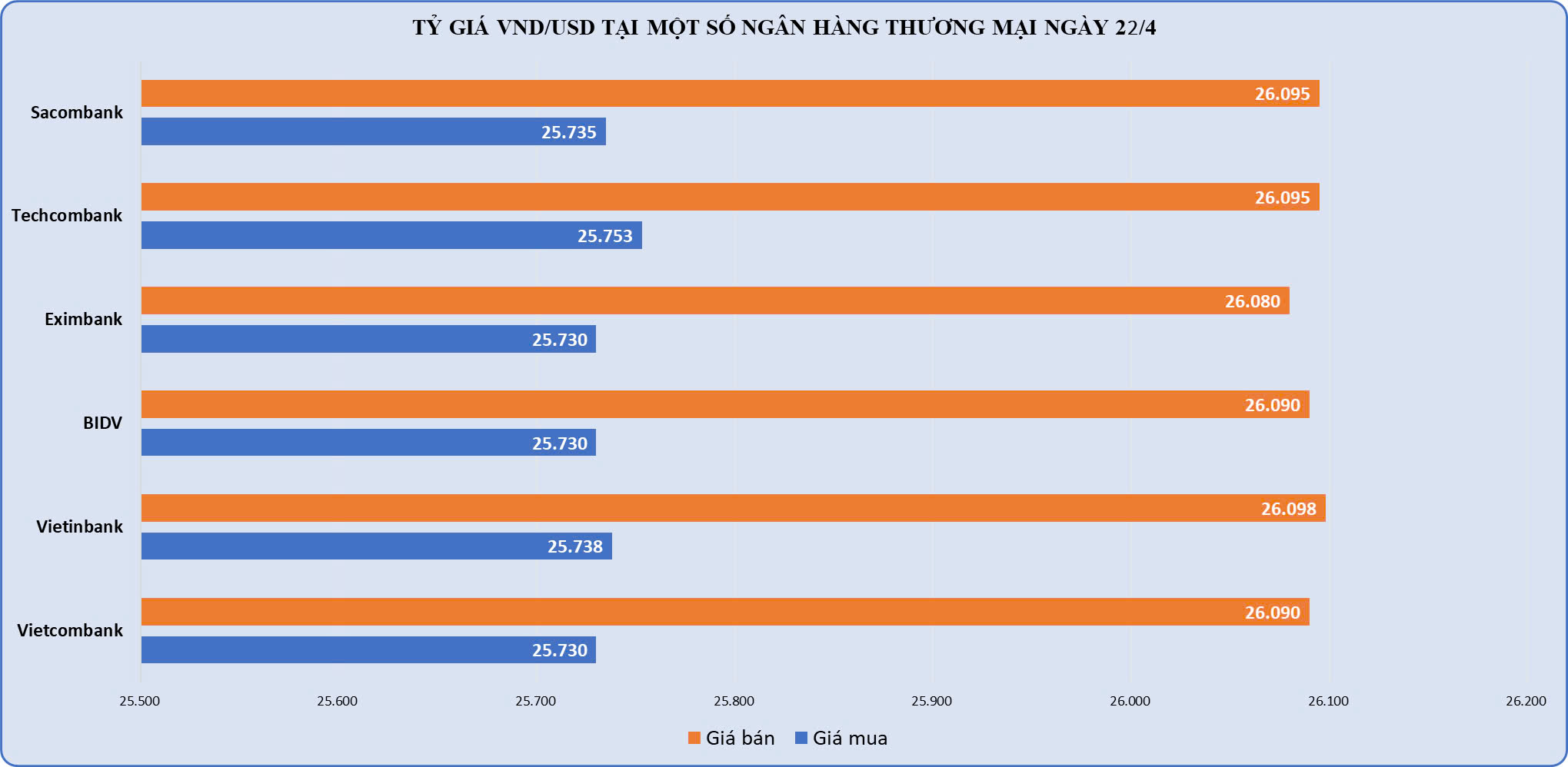 Tại BIDV, giá USD đang niêm yết ở mức 25.730 - 26.090 VND/USD, giảm 10 đồng ở cả hai chiều mua vào và bán ra so với phiên trước đó. Trong khi tại ngân hàng Eximbank, giá USD tăng 10 đồng ở mỗi chiều, đang niêm yết ở mức 25.730 - 26.080 VND/USD.