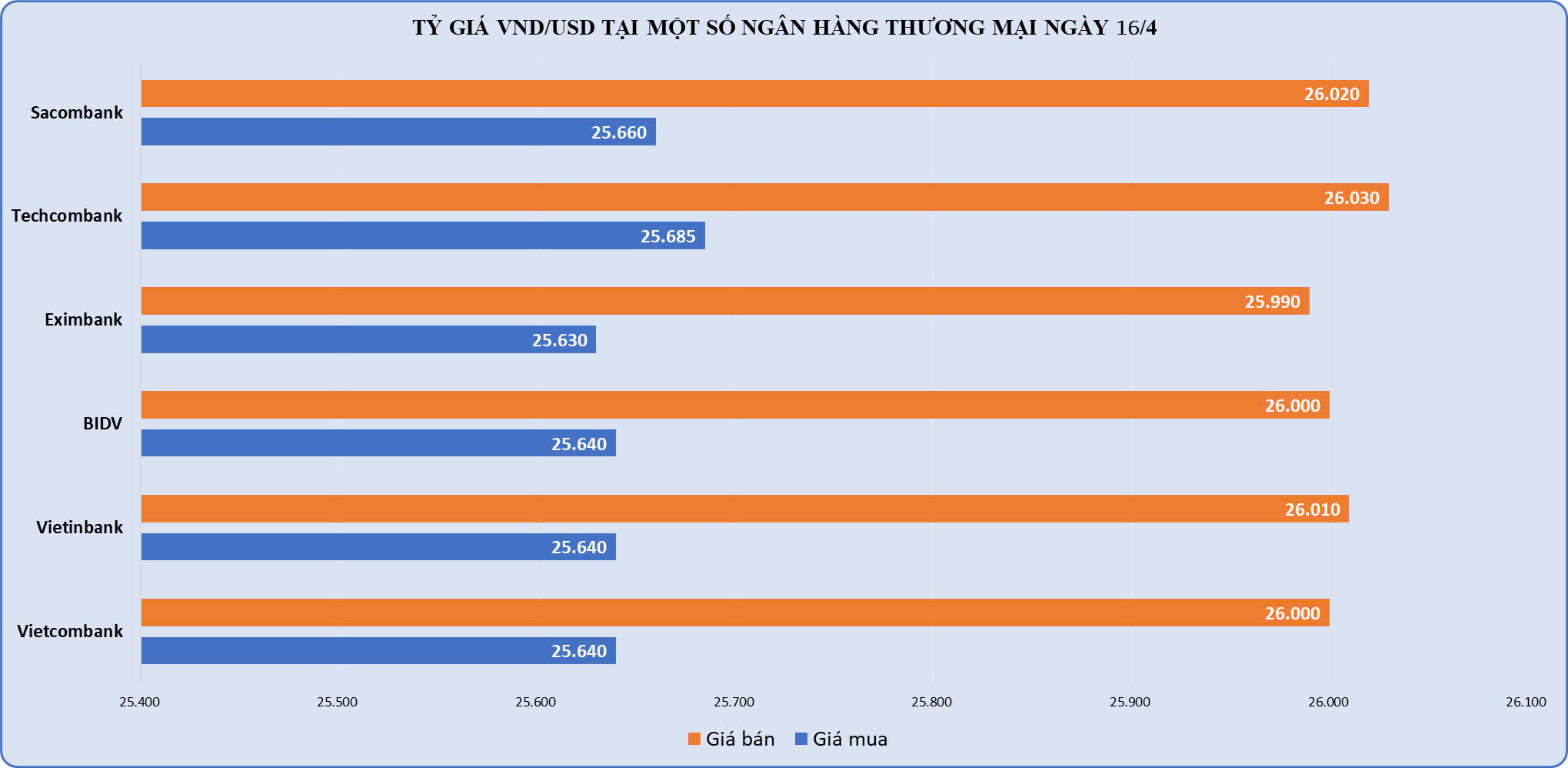 Trên thị trường liên ngân hàng, tỷ giá chốt phiên với mức 25.820 VND/USD, giảm nhẹ 9 đồng so với phiên 14/4. Tỷ giá trên thị trường tự do giữ nguyên ở cả hai chiều mua và bán ra, giao dịch tại 26.020 VND/USD và 26.130 VND/USD.