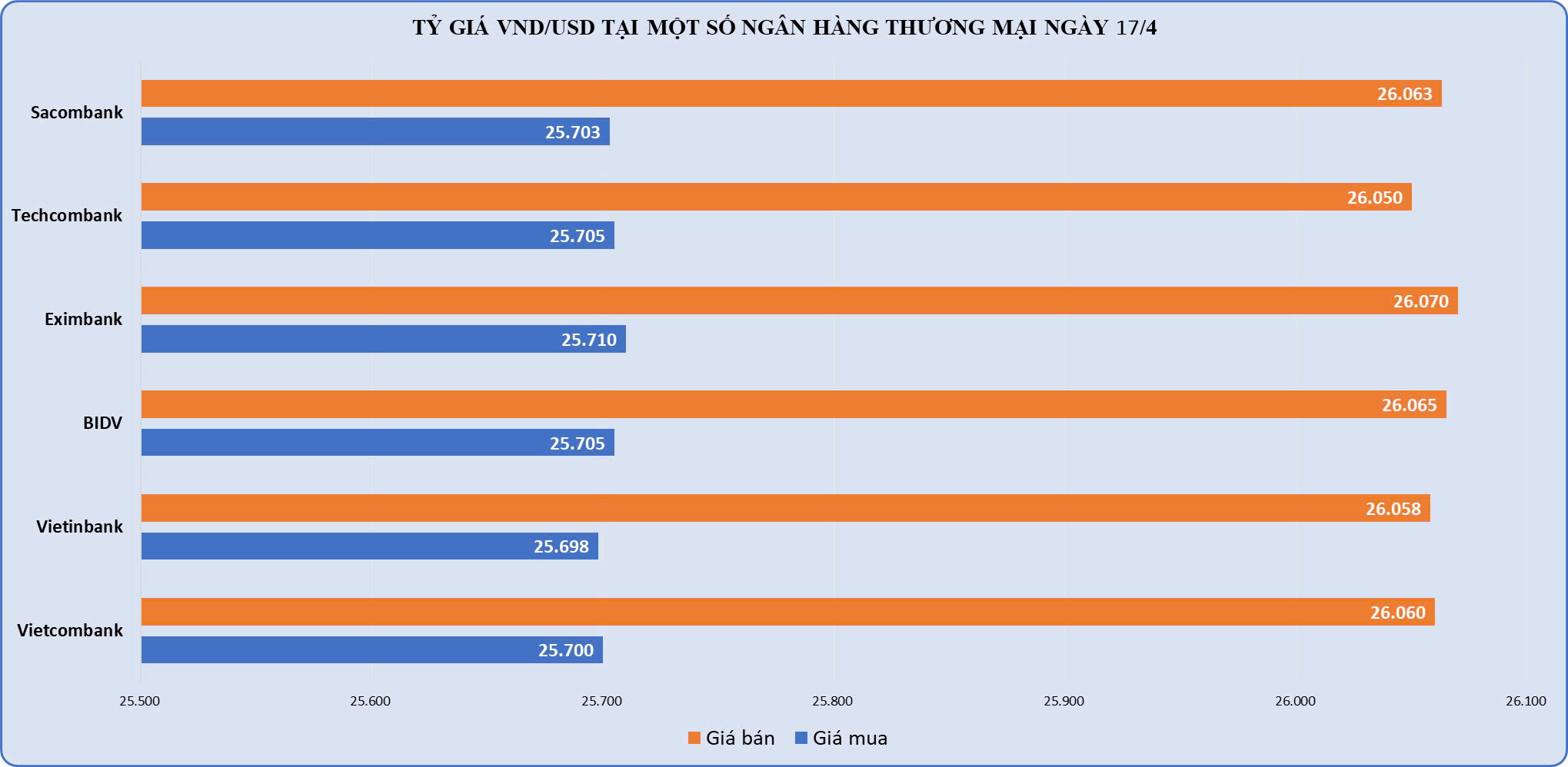 Tại Techcombank, giá USD điều chỉnh tăng 20 đồng ở mỗi chiều đang niêm yết ở mức 25.705 - 26.050 VND/USD. Sacombank niêm yết USD ở mức 25.703 - 26.063 VND/USD, tăng 43 đồng ở hai chiều mua - bán so với phiên trước đó.