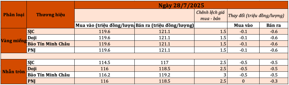 Mở cửa phiên giao dịch sáng nay (28/7), giá mua bán vàng miếng SJC tại Công ty TNHH MTV Vàng bạc đá quý Sài Gòn (SJC) giao dịch ở mức 119,6 – 121,1 triệu đồng/lượng, giảm 0,1 triệu đồng/lượng ở chiều mua và 0,6 triệu đồng/lượng chiều bán so với giá khảo sát phiên trước đó. Chênh lệch giá mua vào - bán ra được thu hẹp xuống còn 1,5 triệu đồng/lượng.