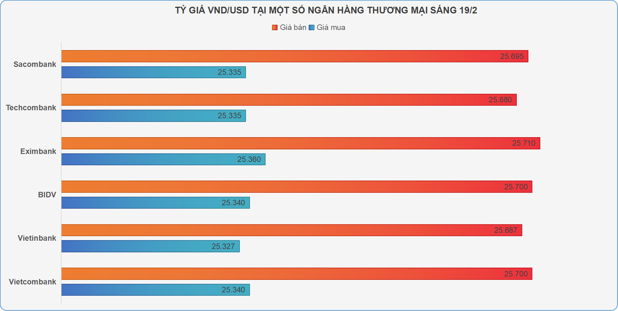 Eximbank giá USD tăng 10 đồng ở chiều mua và giữ nguyên chiều bán so với phiên trước, hiện đang niêm yết USD ở mức 25.360 - 25.710 VND/USD. Trong khi đó, tại Techcombank, giá USD điều chỉnh giảm 65 đồng ở cả hai chiều mua - bán, đang niêm yết ở mức 25.335 - 25.680 VND/USD.