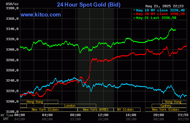Hiện, giá vàng giao ngay trên Kitco đang được giao dịch ở mức 3.336,5 USD/ounce, tăng 46,3 USD, tương đương 1,41% so với chốt phiên trước. Quy đổi theo tỷ giá tại Vietcombank, giá vàng thế giới đang được giao dịch ở mức 105,1 triệu đồng/lượng, thấp hơn giá vàng trong nước khoảng 14,2 triệu đồng/lượng.
