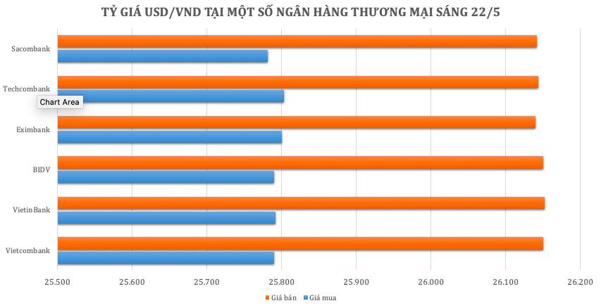 Ngân hàng Eximbank niêm yết USD ở mức 25.800 – 26.140 VND/USD, tăng 10 đồng ở chiều mua so với phiên trước đó. Tại Techcombank, giá USD được điều chỉnh giảm 5 đồng ở chiều mua và 6 đồng chiều bán, đang niêm yết ở mức 25.803 – 26.144 VND/USD. Sacombank niêm yết USD ở mức 25.782 – 26.142 VND/USD, giảm 3 đồng ở mỗi chiều so với phiên liền trước.