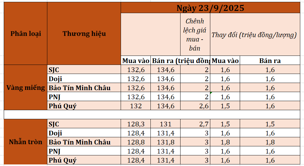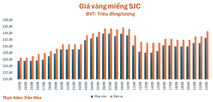 Đầu phiên giao dịch sáng nay (23/9), giá mua – bán vàng miếng SJC ở mốc 132,6 – 134,6 triệu đồng/lượng, tăng 1,6 triệu đồng/lượng ở cả chiều mua và chiều bán so với giá khảo sát sáng qua. Chênh lệch giá mua – bán ở mức 2 triệu đồng/lượng.