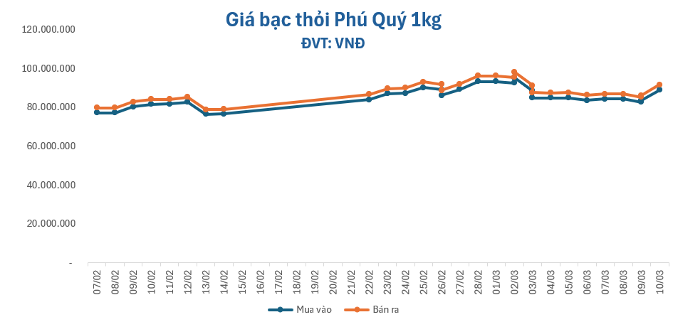 Giá bạc thỏi 1kg tăng khoảng 5.000.000 đồng/kg, giao dịch ở mức 88.639.778 – 91.386.438 đồng/kg (mua – bán), tăng 4.906.654 đồng ở chiều mua và tăng 5.066.654 đồng ở chiều bán.
