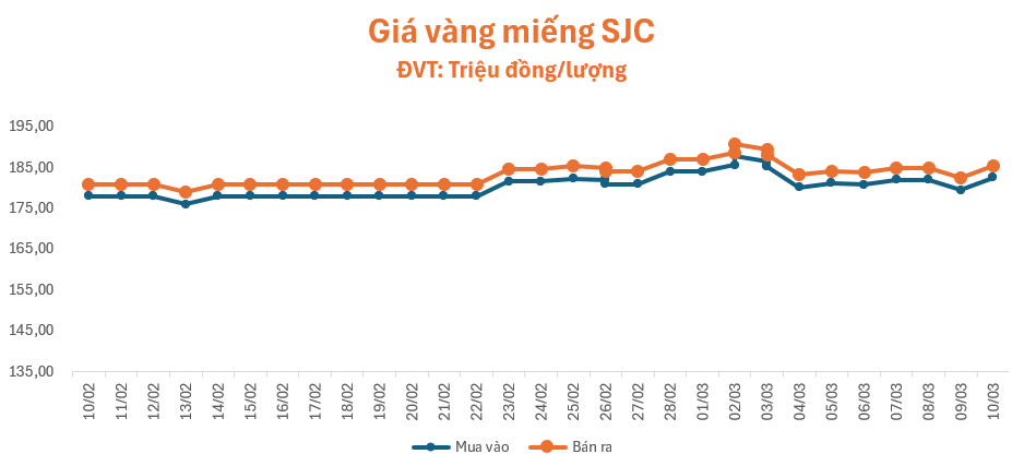 Phiên giao dịch sáng nay (10/3), lúc 10 giờ 30 phút, giá vàng miếng SJC tại cửa hàng SJC, Bảo Tín Minh Châu, PNJ và Doji đều niêm yết ở mức 183,1 - 186,1 triệu đồng/lượng (mua – bán), tăng 3,6 triệu đồng/lượng ở cả chiều mua và chiều bán so với giá khảo sát sáng qua, chênh lệch mua – bán ở mức 3 triệu đồng/lượng.