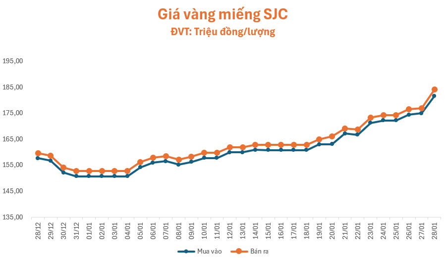Phiên giao dịch chiều nay (28/01), lúc 16 giờ 30 phút, giá vàng miếng SJC ở hầu hết các cửa hàng lớn như SJC, Bảo Tín Minh Châu, Doji và PNJ đều tăng thêm 3,6 triệu đồng/lượng so với phiên sáng, niêm yết ở mức 181,7 – 184,2 triệu đồng/lượng (mua – bán), chênh lệch hai chiều giữ ở ngưỡng 2,5 triệu đồng/lượng.