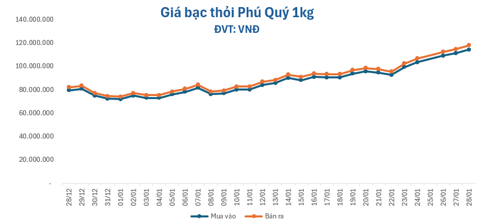 Giá bạc thỏi 1kg được điều chỉnh giảm sau khi thiết lập kỷ lục mới trên mốc 119.000.000 đồng/kg, giao dịch ở mức 112.559.719 – 116.053.043 đồng (mua – bán), giảm 1.706.662 đồng ở chiều mua và giảm 1.759.996 đồng ở chiều bán.