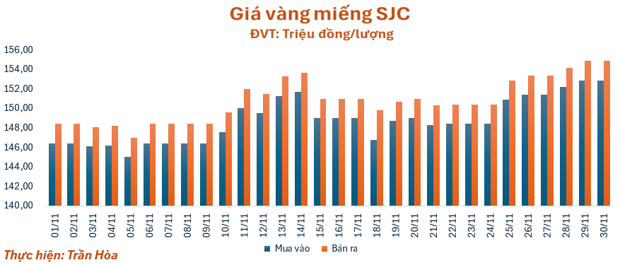Tính đến ngày cuối cùng tháng 11, giá vàng miếng SJC đã tăng 6,5 triệu đồng/lượng ở cả chiều mua và chiều bán so với giá đóng cửa phiên đầu tháng, niêm yết ở mốc 152,9 – 154,9 triệu đồng/lượng. Với mức giá này đã xô đổ mọi kỷ lục trước đó, vượt qua mốc đỉnh cũ 154,6 triệu đồng vào ngày 21/10.