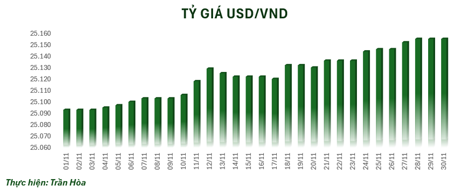 Kết thúc tháng 11, tỷ giá USD được niêm yết ở mốc 25.155 VND/USD, tăng 62 đồng so với giá chốt phiên đầu tháng. Các ngân hàng thương mại cũng được điều chỉnh tăng chiều bán theo tỷ giá trung tâm.
