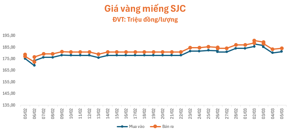 Giá vàng tăng mở đầu phiên giao dịch sáng nay (05/03). Lúc 10 giờ, giá vàng miếng SJC tại cửa hàng SJC, Phú Quý, Bảo Tín Minh Châu, PNJ và Doji đều niêm yết ở mức 181,7 – 184,7 triệu đồng/lượng (mua – bán), tăng 1,5 triệu đồng/lượng so với giá khảo sát sáng qua, chênh lệch mua – bán ở mức 3 triệu đồng/lượng.
