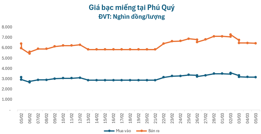 Giá bạc nhích nhẹ, tại Phú Quý, giá bạc miếng niêm yết ở mức 3.189.000 – 3.288.000 đồng/lượng, tăng 5.000 đồng chiều mua và tăng 6.000 đồng chiều bán so với giá khảo sát sáng qua.