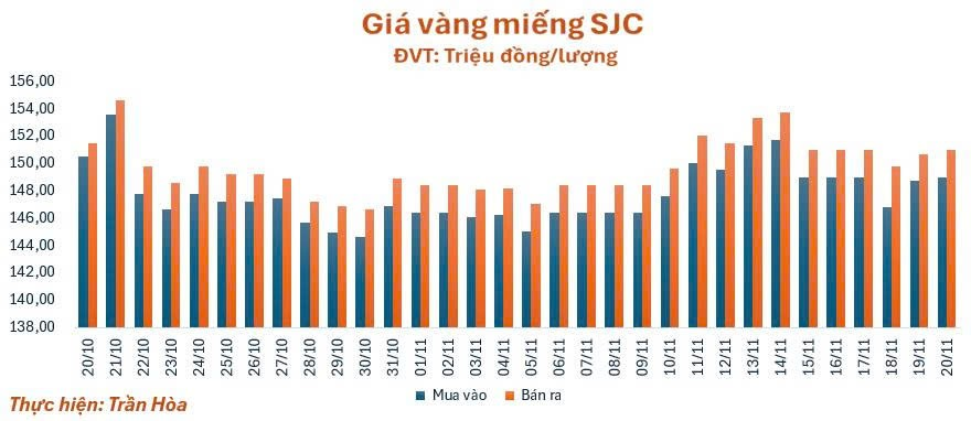 Phiên giao dịch hôm nay (20/11), giá vàng miếng SJC tăng nhẹ 0,3 triệu đồng/lượng so với giá khảo sát sáng qua, quanh mốc 149 - 151 triệu đồng/lượng (mua – bán). Chênh lệch giá mua vào - bán ra ở ngưỡng 2 triệu đồng/lượng.