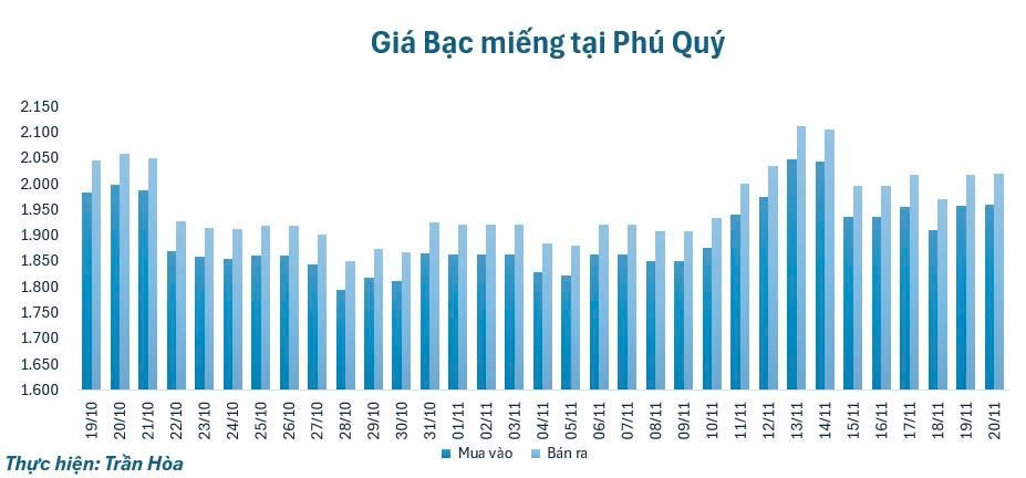 Giá bạc sáng 20/11 được điều chỉnh tăng, tại Phú Quý, giá bạc miếng niêm yết ở mốc 1.960.000 – 2.021.000 đồng/lượng, tăng 2.000 đồng ở cả chiều mua và chiều bán so với cùng thời điểm ngày hôm qua.
