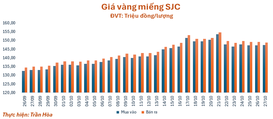 Đầu phiên giao dịch sáng nay (27/10), lúc 10 giờ giá vàng miếng SJC được điều chỉnh trái chiều giữa chiều mua và chiều bán so với giá chốt phiên tuần trước, quanh mốc 147,4 – 148,9 triệu đồng/lượng (mua – bán), tăng 0,2 triệu đồng/lượng ở chiều mua và giảm 0,3 triệu đồng/lượng ở chiều bán. Chênh lệch giá mua vào - bán ra ở ngưỡng 1,5 triệu đồng/lượng.