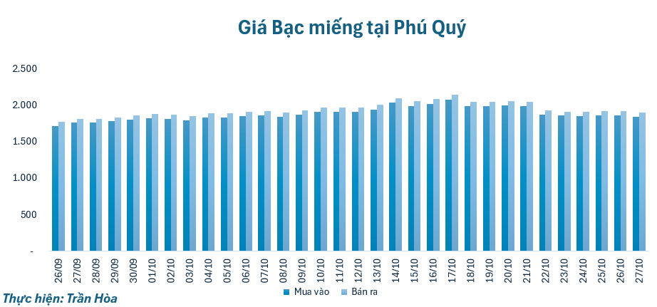 Giá bạc sáng 27/10 giảm nhẹ so với giá đóng cửa phiên cuối tuần trước, tại Phú Quý, giá bạc giảm 16.000 đồng ở chiều mua và giảm 17.000 đồng chiều bán, đạt mốc 1.845.000 – 1.902.000 đồng/lượng.