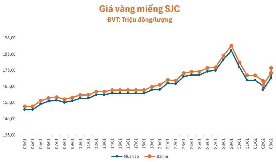 Giá vàng tiếp tục tăng mạnh trong phiên giao dịch chiều nay (03/02). Lúc 16 giờ, giá vàng miếng SJC ở hầu hết các cửa hàng lớn như SJC, Phú Quý, Bảo Tín Minh Châu, Doji và PNJ đều tăng thêm 3 triệu đồng/lượng so với phiên sáng, niêm yết ở mức 173,5 – 176,5 triệu đồng/lượng (mua – bán), chênh lệch hai chiều giữ ở ngưỡng 3 triệu đồng/lượng.