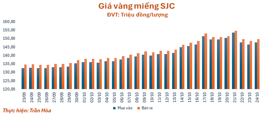 Phiên giao dịch sáng nay (24/10), lúc 10 giờ giá vàng miếng SJC niêm yết ở mức 147,8 – 149,8 triệu đồng/lượng (mua – bán), tăng 1,2 triệu đồng/lượng ở cả chiều bán và chiều bán so với giá khảo sát sáng qua. Chênh lệch giá mua vào - bán ra ở mốc 2 triệu đồng/lượng.