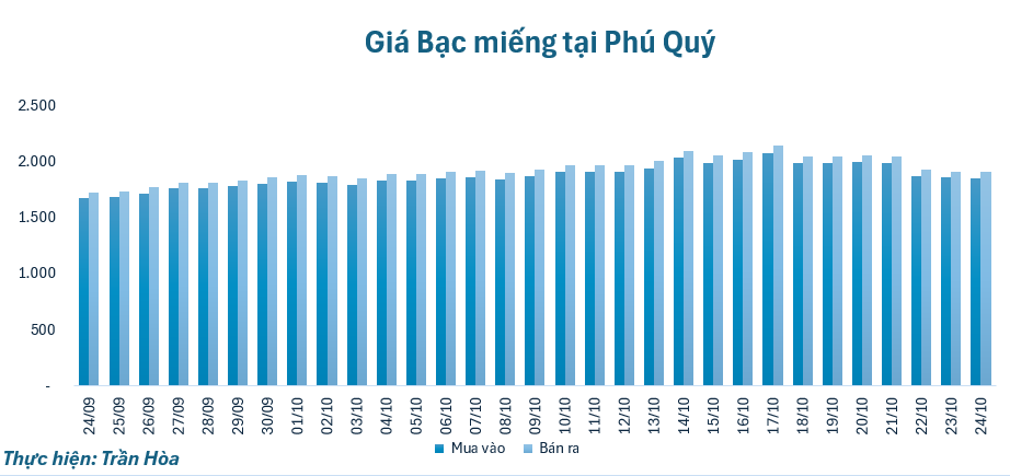 Giá bạc sáng 24/10 giảm nhẹ, tại Phú Quý, giá bạc giảm 3.000 đồng ở chiều mua và chiều bán so với giá khảo sát sáng qua, đạt mốc 1.859.000 – 1.916.000 đồng/lượng.
