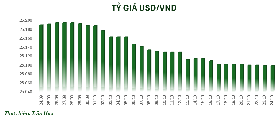 Vào sáng nay, tỷ giá trung tâm đang được niêm yết ở mốc 25.098 VND/USD, không có biến động so với giá khảo sát sáng qua. Tại một số ngân hàng thương mại, giá USD hầu như không thay đổi.
